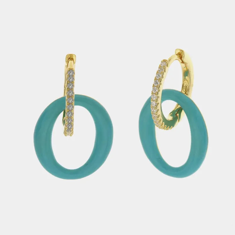 Orecchini in Argento 925 a cerchietto con chiusura a scatto tempestata da zirconi e cerchio in smalto azzurro pendente