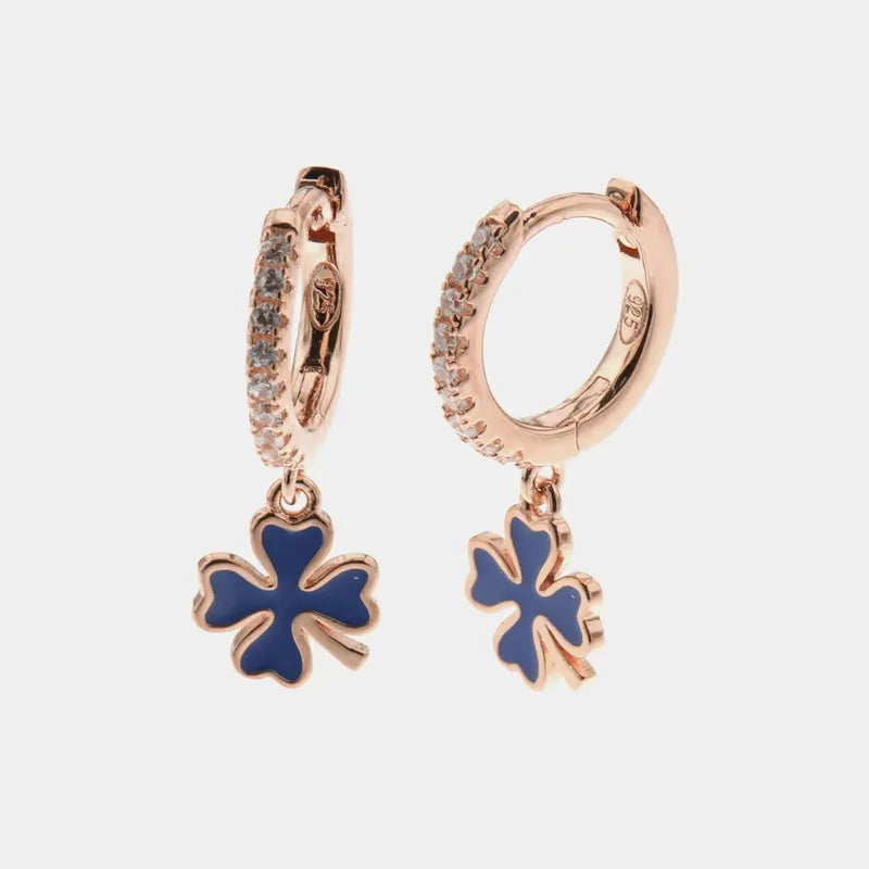 Orecchini in Argento 925 cerchietti con zirconi bianchi con pendenti a forma di quadrifoglio smaltati blu
